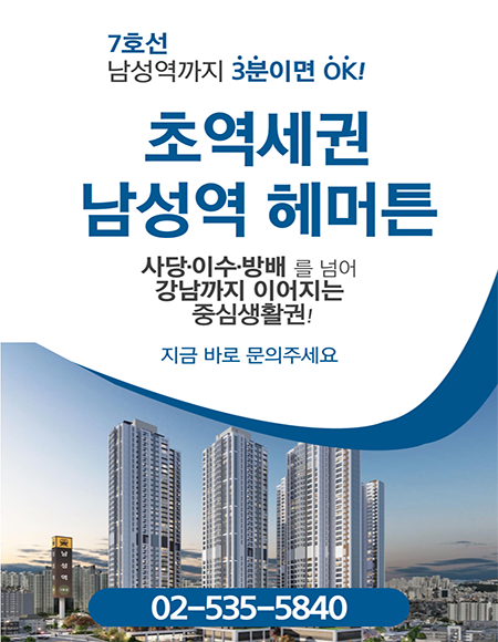 지하철 7호선 남성역 이용이 편리하며, 이수역(7·4호선 환승역)과도 인접해 이동 선택지가 넓습니다. 강남·여의도·도심 이동 속도가 빠르고 도로 교통 접근성도 우수한 편입니다.